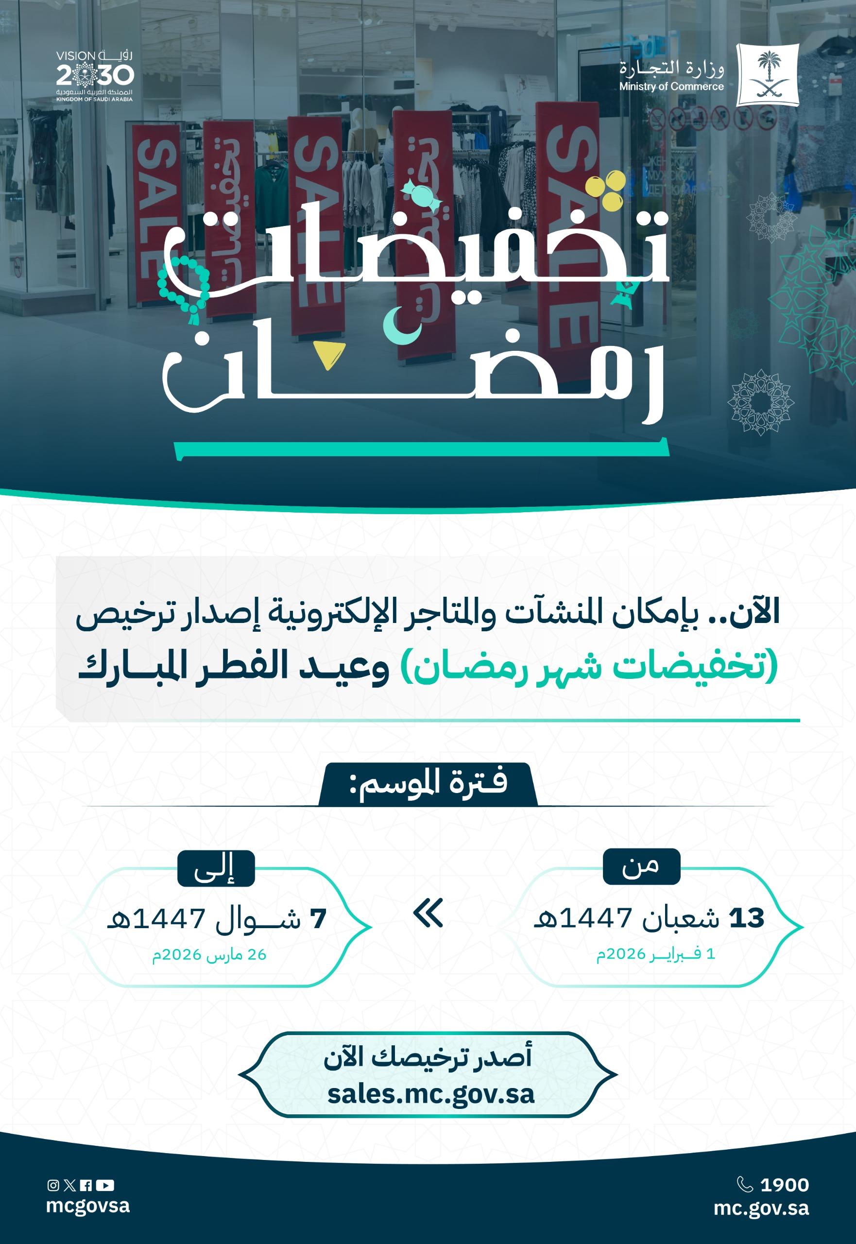 أعلنت وزارة التجارة عن بدء موسم تخفيضات شهر رمضان المبارك اعتبارًا من 13 شعبان 1447هـ, الموافق 1 فبراير 2026م.