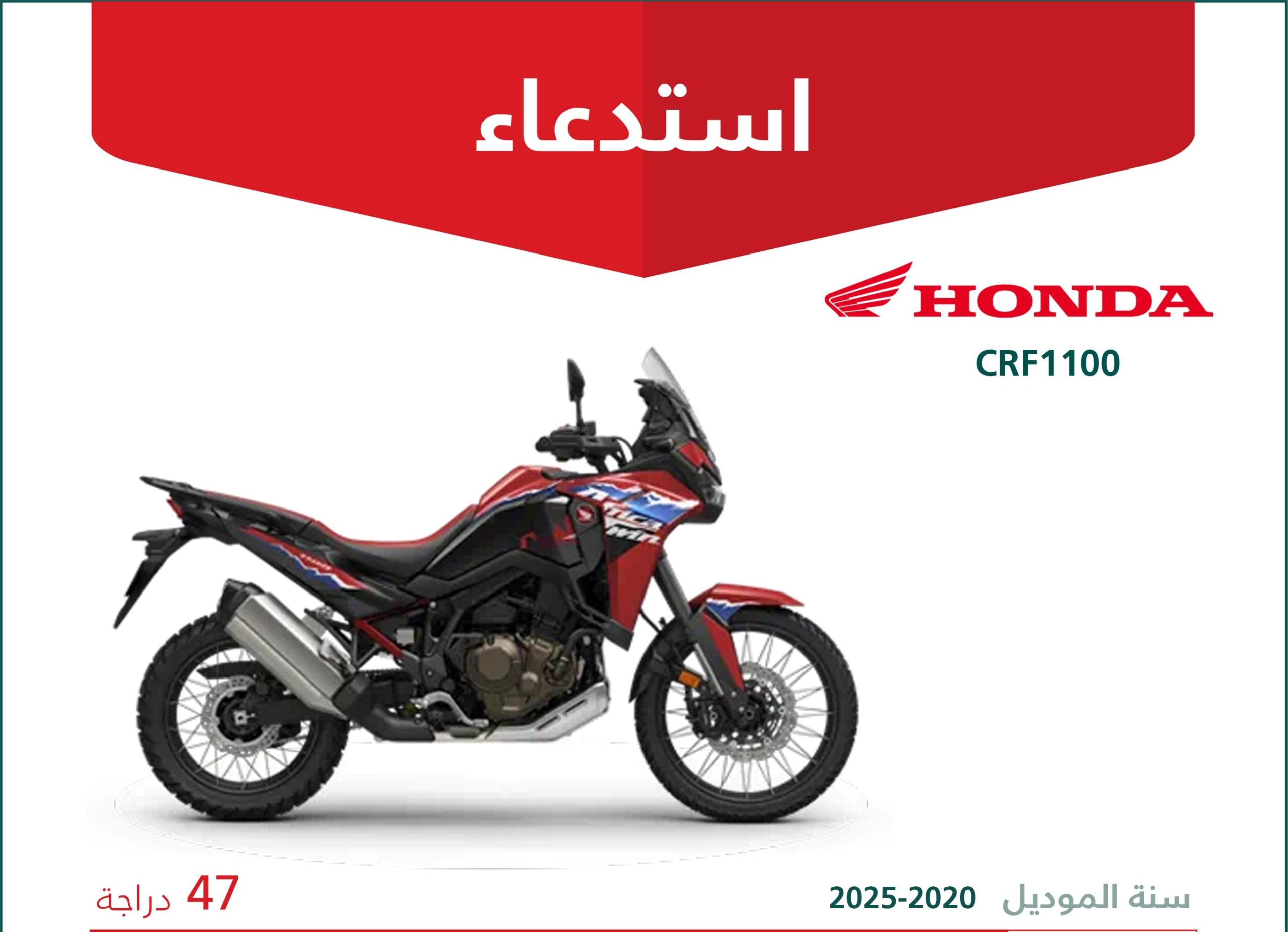 أعلنت وزارة التجارة عن استدعاء 47 دراجة نارية من نوع هوندا CRF1100، موديلات 2020 – 2025، وذلك لوجود خلل فني محتمل.