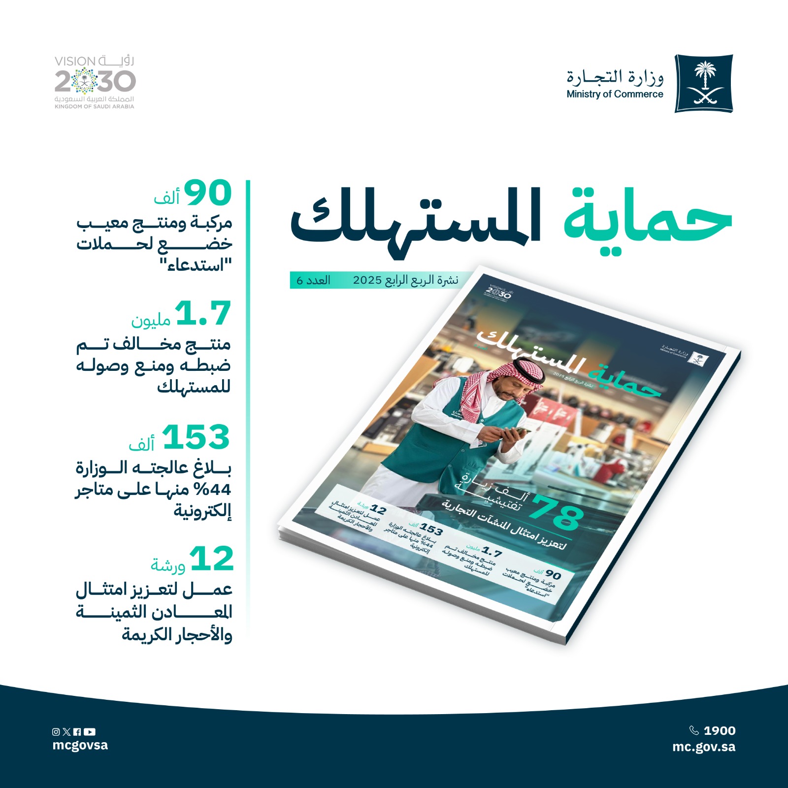 أصدرت وزارة التجارة نشرتها الربعية لحماية المستهلك عن الربع الرابع 2025، متضمنة أبرز الأعمال والجهود في مجالات مكافحة الغش التجاري ومكافحة التستر التجاري والتجارة الإلكترونية وغيرها.