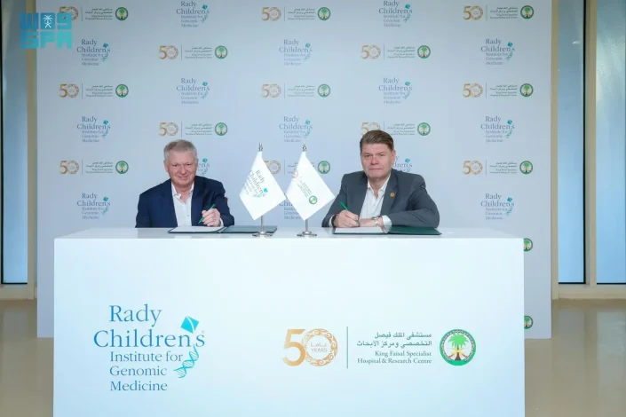 صراحة – واس: وقّع مستشفى الملك فيصل التخصصي ومركز الأبحاث، اتفاقية شراكة مع معهد رادي لطب الجينوم للأطفال بالولايات المتحدة، للتعاون في تطوير منصة لإجراء فحوصات جينية متقدمة للأطفال حديثي الولادة، للكشف عن نحو 500 مرض وراثي قابل للعلاج والوقاية، ويسهم في حماية الأطفال من المضاعفات الخطيرة ويدعم التدخل العلاجي في الوقت المناسب.
