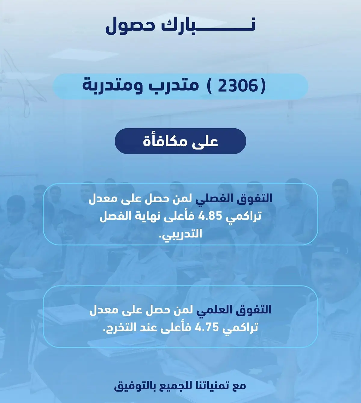 من (5.00) وفق الدرجات المدخلة في النظام في نهاية الفصل الأخير للمتدرب، مبينةً أنه قد حصل كل خريج متفوق على مبلغ مالي مقداره (2000) ريال، وشهادة تفوق، كما حصل (669) متدربًا ومتدربة على مكافأة التفوق الفصلي، حيث تُمنح المكافأة للمتدرب المستمر الذي أنهى الفصل التدريبي الثالث بالكليات التقنية، والمستوى الخامس لمتدربي المعاهد الثانوية وفق خطتهم التدريبية، ويتطلب لاستحقاقها حصول المتدرب على معدل تراكمي لا يقل عن (4.85) من (5.00) وفق الدرجات المدخلة في نظام المنشآت التدريبية، وقد حصل كل خريج متفوق على مبلغ مالي مقداره (1000) ريال.