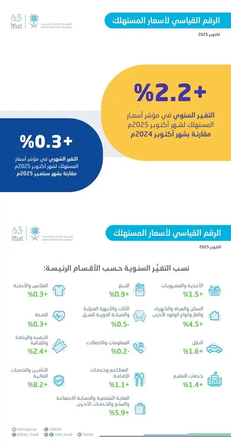 أظهرت بيانات الهيئة العامة للإحصاء أن الرقم القياسي لأسعار المستهلك في المملكة ارتفاع بنسبة 2.2% خلال شهر أكتوبر 2025 مقارنة بالشهر المماثل من عام 2024، محافظاً على نفس معدل التضخم المسجل في سبتمبر الماضي.