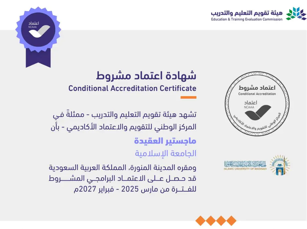 حصلت الجامعة الإسلامية بالمدينة المنورة اليوم، على الاعتماد البرامجي من المركز الوطني للتقويم والاعتماد الأكاديمي “اعتماد “، لبرنامجيّ الماجستير في “الدعوة، وفي العقيدة” وبرنامج الدكتوراه في فقه السنة، وذلك حتى فبراير من العام عام 2027م.