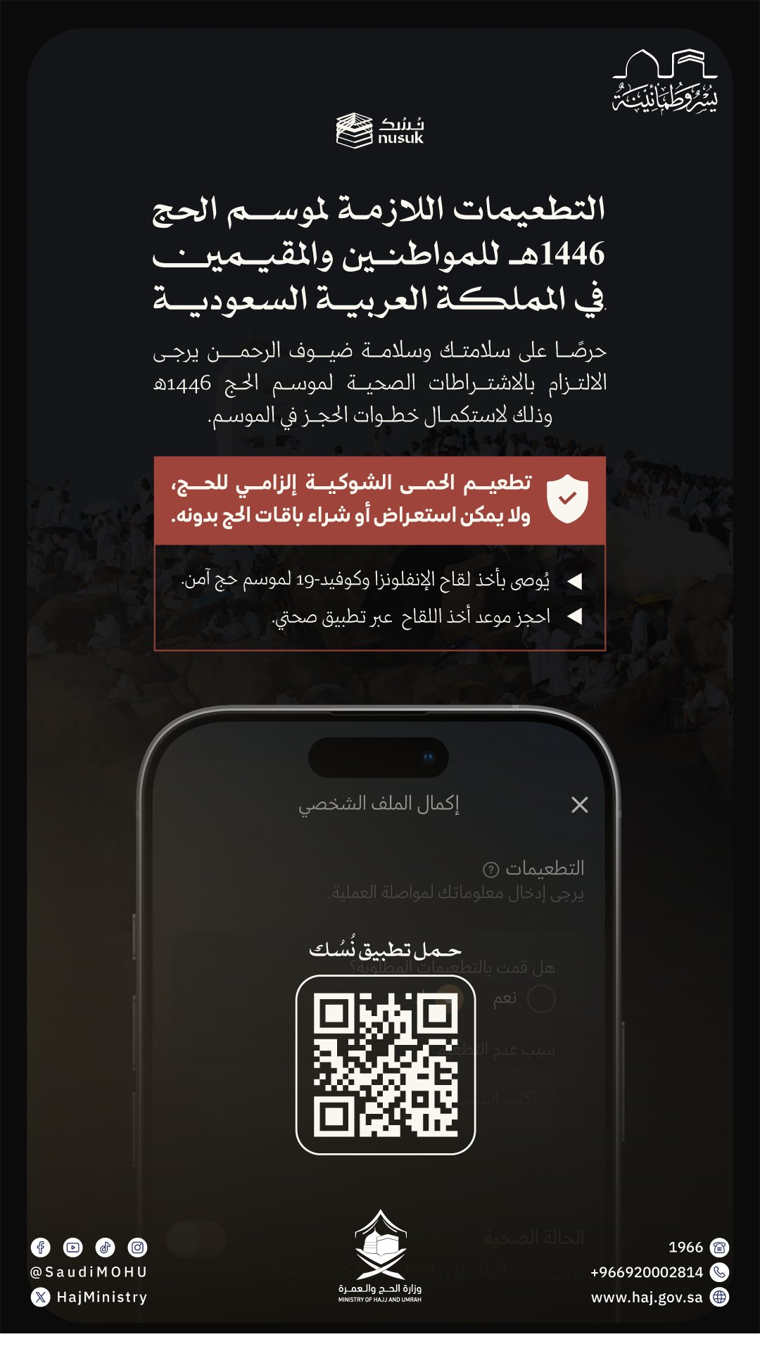 صراحة – الرياض: أعلنت وزارة الحج والعمرة أن الحصول على تطعيم الحمى الشوكية إلزامي،لأداء مناسك حج 1446هـ بصحةٍ وأمان،لحجاج الداخل من الموطنين والمقيمين، إضافة إلى أخذ التطعيمات الموصى بها .