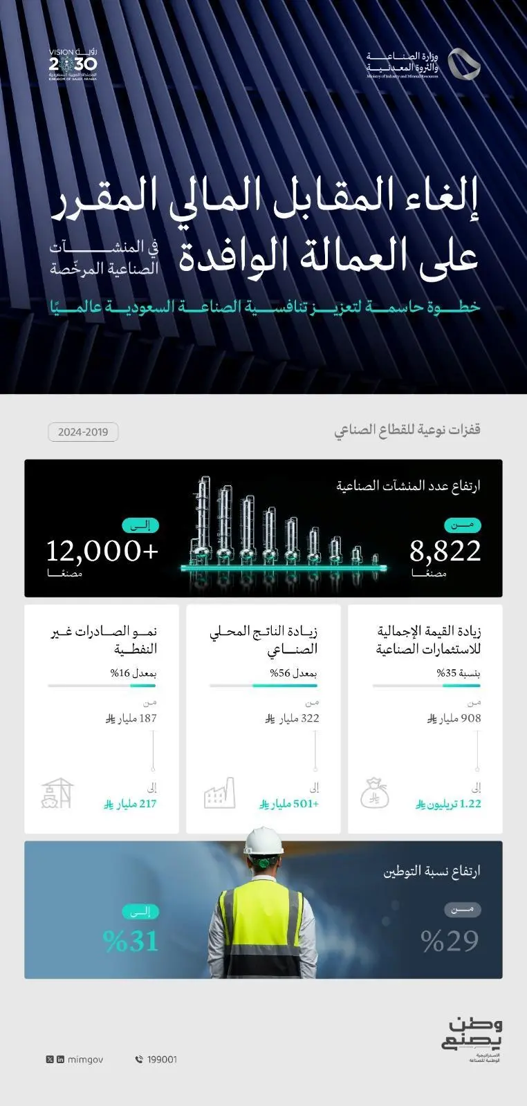 وأشار معاليه إلى أن قرار مجلس الوزراء بالموافقة على إلغاء المقابل المالي المقرر على العمالة الوافدة في المنشآت الصناعية المرخّص لها بترخيص صناعي؛ سيعزز التنمية الصناعية المستدامة في المملكة، ويسهم في تطوير القدرات الصناعية الوطنية، ويستقطب المزيد من الاستثمارات النوعية في ظل ما تقدمه منظومة الصناعة من ممكنات وحوافز، كما يخفض التكاليف التشغيلية في المصانع لتمكينها من التوسع والنمو وزيادة إنتاجها، ويسرّع تبني المنشآت الصناعية لنماذج العمل الحديثة كحلول الأتمتة والذكاء الاصطناعي وتقنيات التصنيع المتقدم، بما يرفع كفاءة القطاع الصناعي ويعزَّز قدراته على المنافسة عالميًا.