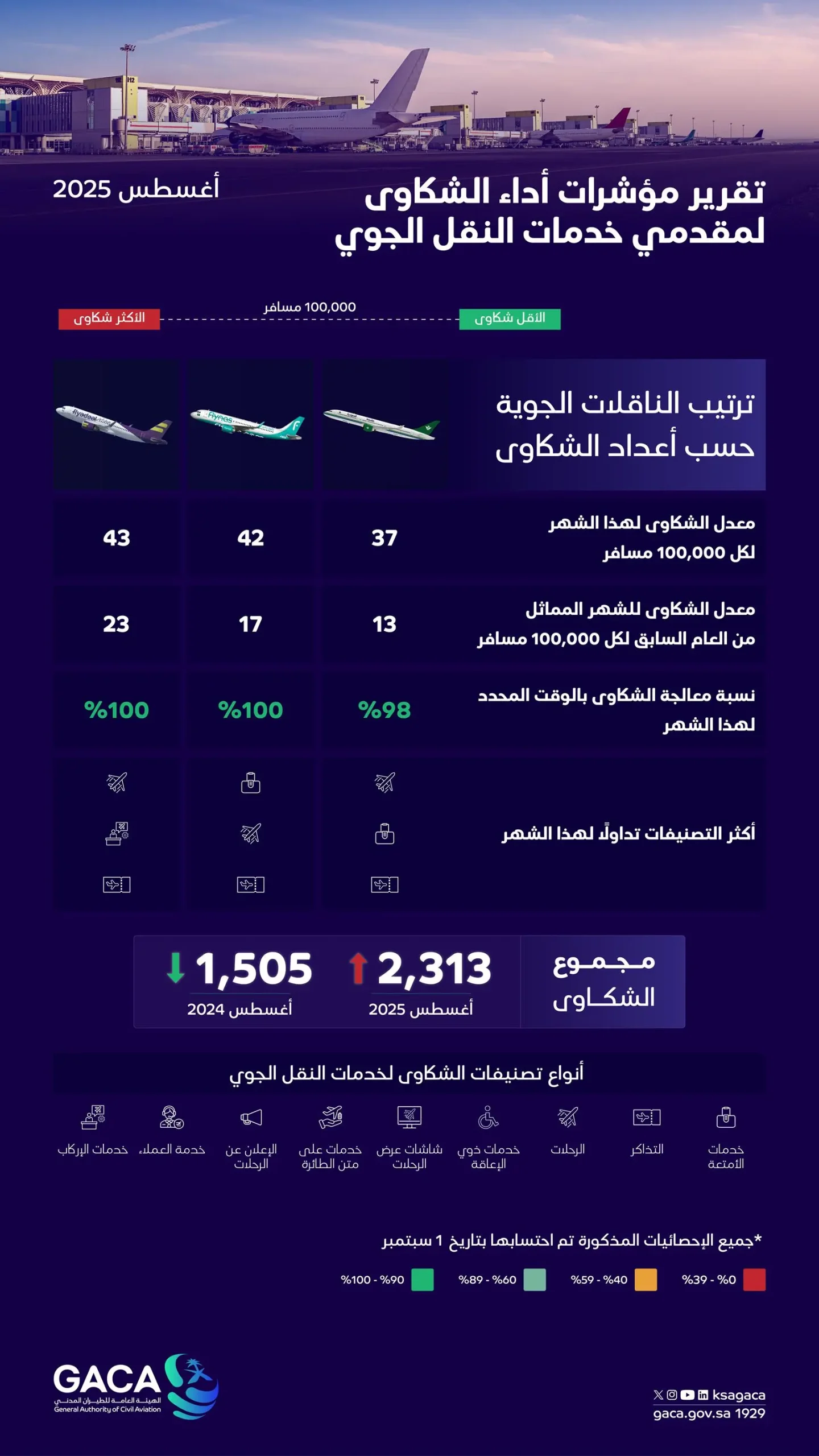 وأوضحت أن عدد شكاوى المسافرين على الناقلات الجوية بلغ (2313) شكوى، مبينةً أنَّ الخطوط الجوية السعودية جاءت أقلّ شركات الطيران شكاوى بواقع (37) شكوى لكل 100 ألف مسافر، وبنسبة معالجة للشكوى بالوقت المحدد لشهر أغسطس إلى 98%، بينما حلَّ طيران ناس ثانيًا بواقع (42) شكوى لكل (100) ألف مسافر، وبنسبة معالجة للشكوى بالوقت المحدد إلى (100%)، وجاء ثالثًا “طيران أديل”، حيث وصل عدد الشكاوى إلى (43) شكوى لكل (100) ألف مسافر، وبنسبة معالجة للشكوى بالوقت المحدد إلى (100%).