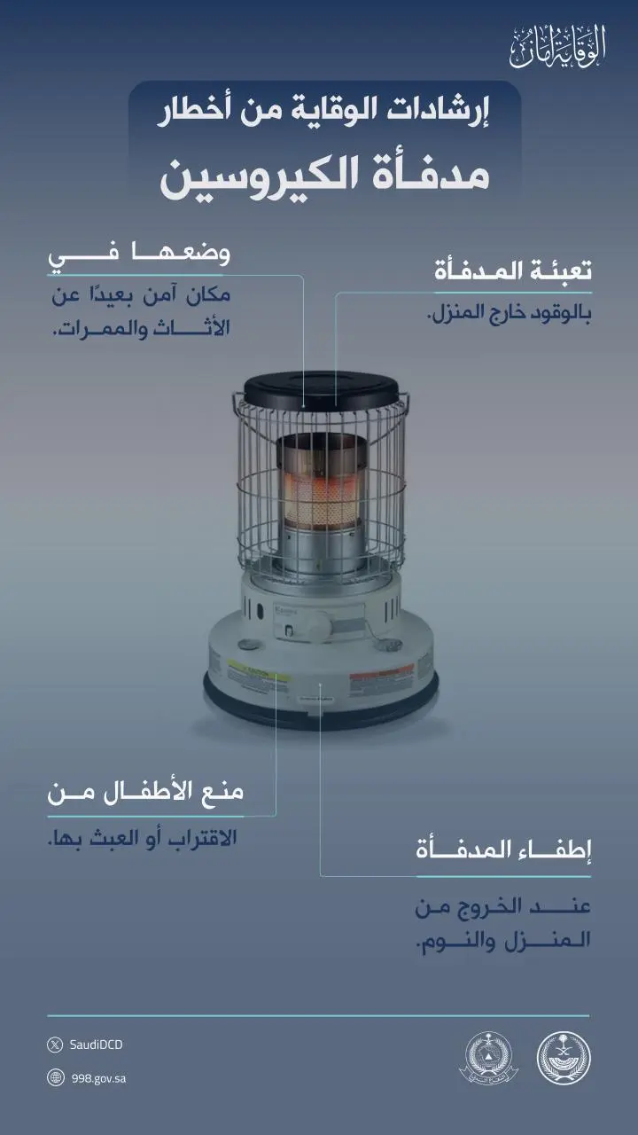 أكدت المديرية العامة للدفاع المدني اتباع إجراءات السلامة عند استخدام مدفأة الكيروسين، وضرورة تعبئتها بالوقود خارج المنزل، ومنع الأطفال من الاقتراب أو العبث بها، وإطفائها عند الخروج من المنزل أو عند النوم، ووضعها في مكان آمن وبعيد عن الأثاث والممرات.