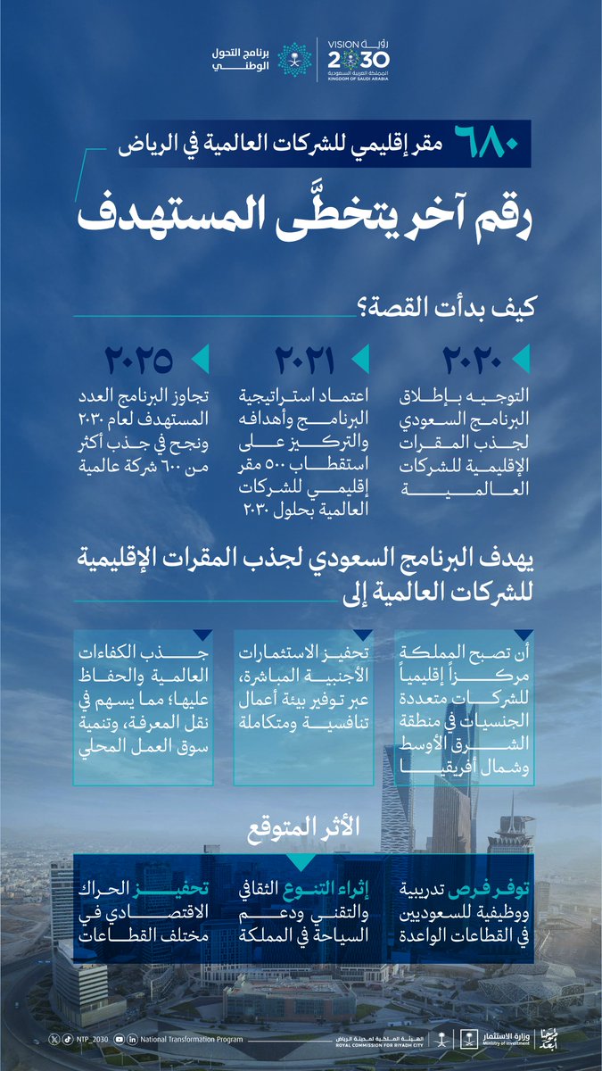السعودية تتجاوز مستهدفاتها وتستقطب 680 مقرًا إقليميًا للشركات العالمية في الرياض