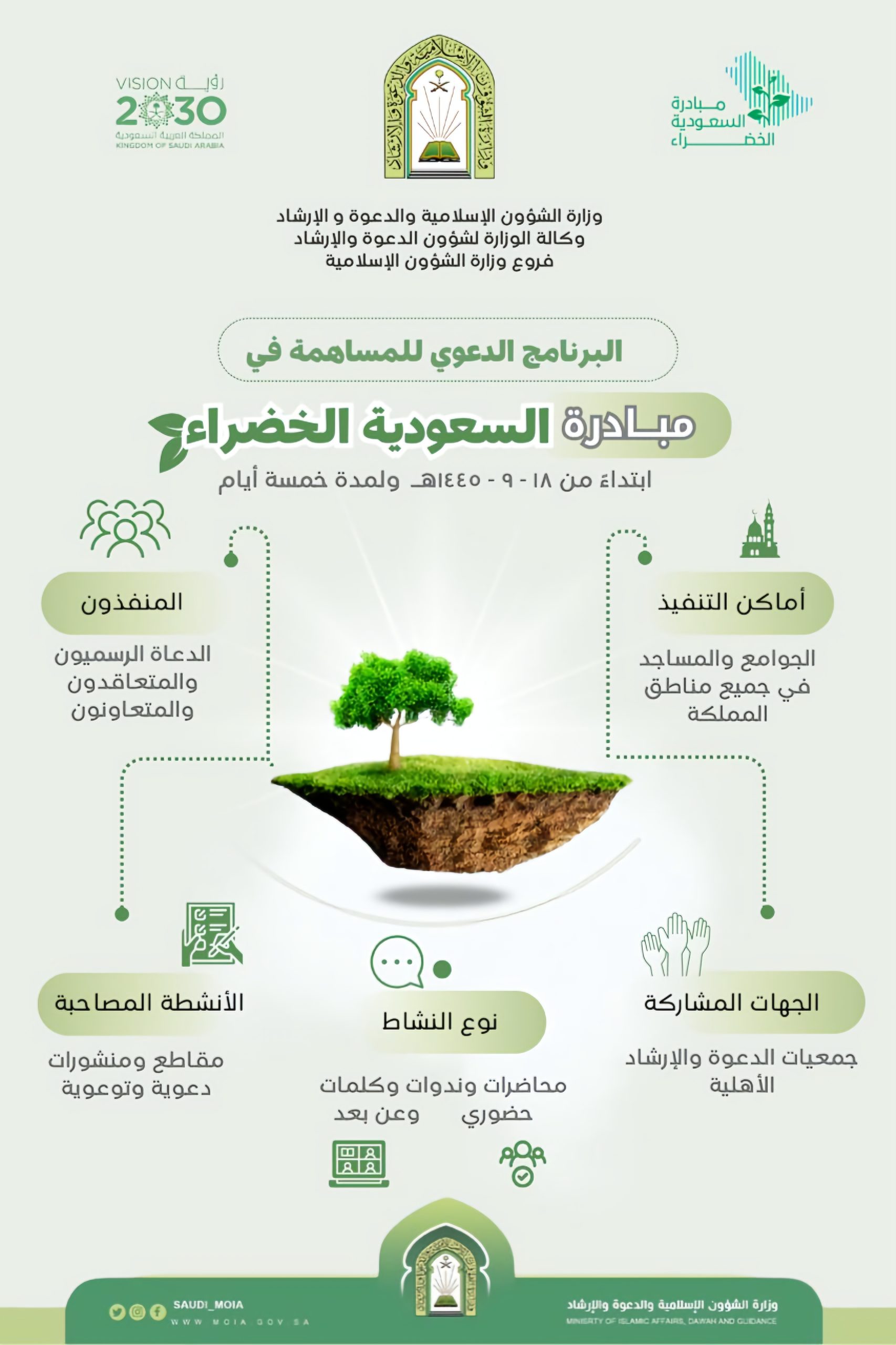 تنظم وزارة الشؤون الإسلامية والدعوة والإرشاد ممثلة بوكالة الوزارة للدعوة والإرشاد عبر فروعها بمختلف مناطق المملكة، البرنامج الدعوي للمساهمة في مبادرة السعودية الخضراء، في الجوامع والمساجد بمختلف مناطق المملكة ولمدة خمسة أيام ابتداء من الثامن عشر من شهر رمضان لعام 1445هـ يقدمها عدد من المشايخ والدعاة.