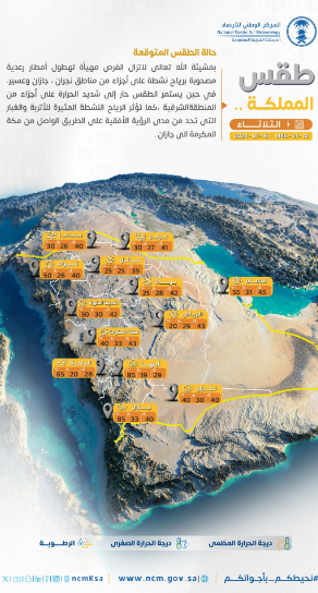 | نجران | 40 | 30 | 40 | أمطار رعدية |