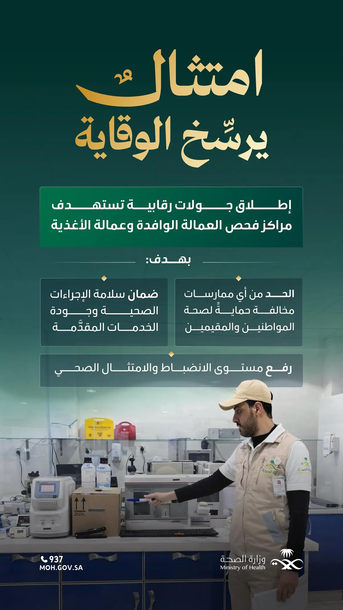 أطلقت وزارة الصحة جولات رقابية تستهدف مراكز فحص العمالة الوافدة وعمالة الأغذية، وذلك ضمن جهودها المستمرة لتعزيز الرقابة الصحية وحماية الصحة العامة، ورفع مستوى الامتثال للاشتراطات الصحية، بما يضمن دقة وسلامة الإجراءات الطبية، والإسهام في تعزيز الوقاية والجاهزية لمواجهة المخاطر الصحية، انسجامًا مع مستهدفات برنامج تحول القطاع الصحي المنبثق من رؤية المملكة 2030.