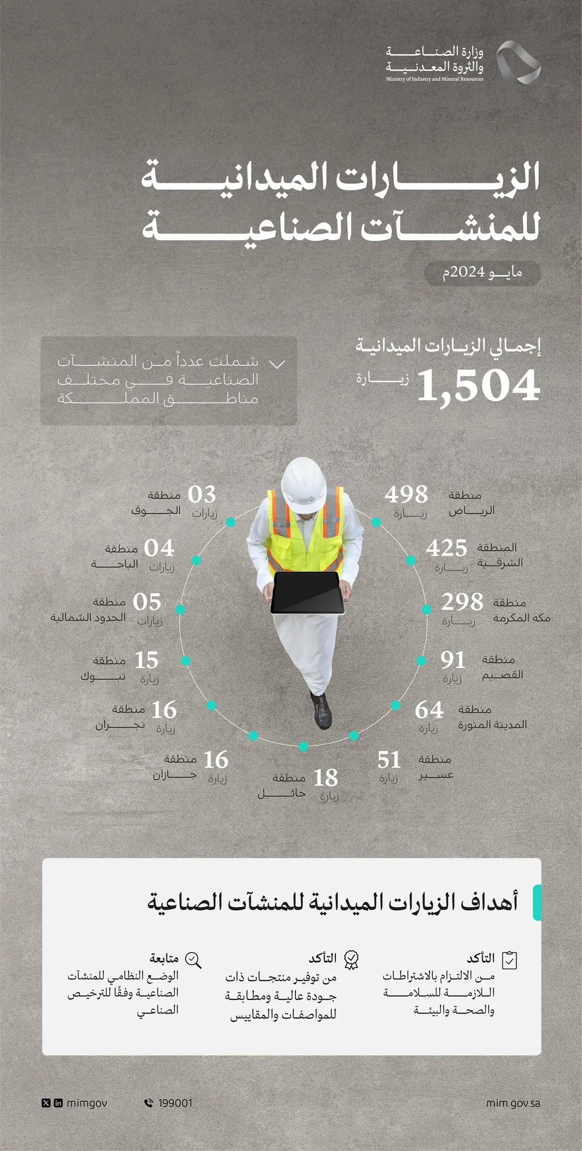 صراحة – الرياض: نفذت وزارة الصناعة والثروة المعدنية ممثلة في الإدارة العامة للفروع؛ “1,504” زيارات ميدانية على المنشآت الصناعية في جميع مناطق المملكة خلال شهر مايو الماضي؛ وذلك في إطار جولات الوزارة الدورية لمتابعة المصانع، والوقوف على مدى جاهزيتها، والتأكد من التزامها بتطبيق معايير الجودة والاشتراطات اللازمة.