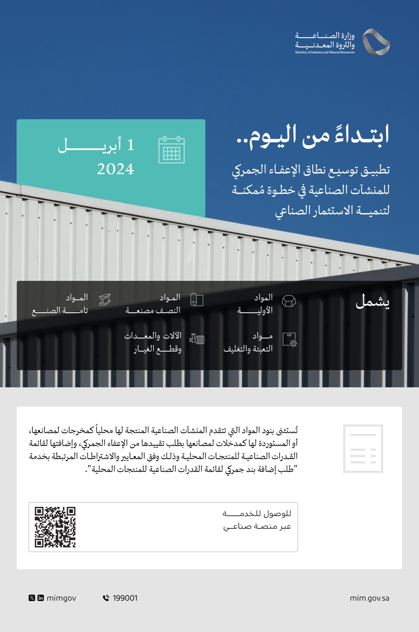 ويشمل الإعفاء الجمركي الجديد الذي دخل حيز التنفيذ اعتباراً من اليوم 1 أبريل 2024م، (المواد الأولية، والمواد النصف مصنعة، والمواد تامة الصنع، ومواد التعبئة والتغليف، والآلات والمعدات وقطع الغيار)، المطلوبة بشكل مباشر لعمليات الإنتاج الصناعي بدون أي تقييد، باستثناء بنود المواد التي تتقدم المنشآت الصناعية المنتجة لها محلياً كمخرجات لمصانعها، أو المستوردة لها كمدخلات لمصانعها،وفق المعايير والاشتراطات المرتبطة بخدمة طلب إضافة بند جمركي لقائمة القدرات الصناعية للمنتجات المحلية؛ لحجبها من الإعفاء الجمركي، وإضافتها لقائمة القدرات الصناعية للمنتجات المحلية.