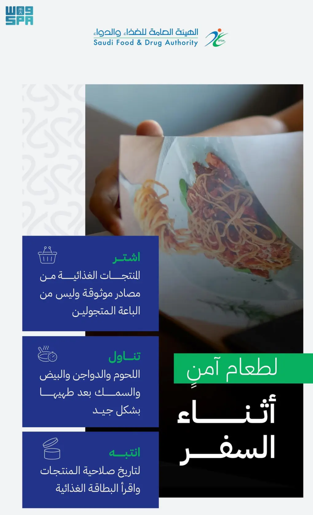وحذرت “الهيئة” – في انطلاقة حملتها -، المسافرين من تناول الأطعمة المكشوفة أو من الباعة الجائلين، مؤكدةً أهمية شراء المنتجات من مصادر موثوقة، لافتةً الانتباه إلى ضرورة التأكد من تاريخ صلاحيتها قبل تناولها، وقراءة البطاقة الغذائية والتأكد من صحتها وسلامتها، مشيرةً إلى أن اتباع التعليمات يسهم في سلامة الأغذية خلال السفر.