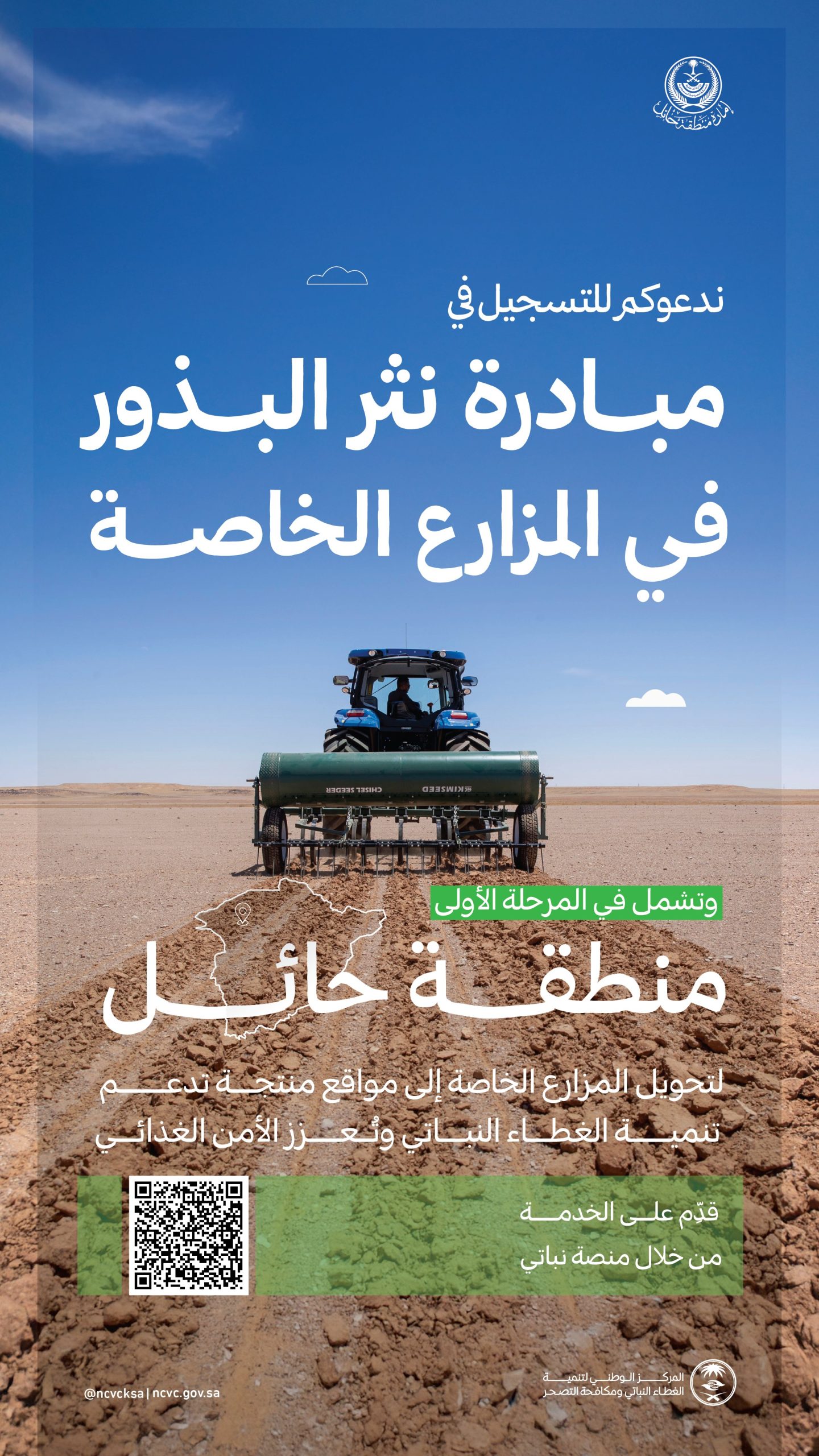 أطلق المركز الوطني لتنمية الغطاء النباتي ومكافحة التصحر, المرحلة الأولى من مبادرة “نثر البذور في المزارع الخاصة” في منطقة حائل، بالتعاون مع إمارة المنطقة, وذلك امتدادًا لنجاح مبادرة نثر البذور، وانطلاقًا من دور المركز في تنمية الغطاء النباتي، وتعزيز الاستخدام الأمثل للموارد الطبيعية، وتوفير بدائل مستدامة تسهم في تحقيق مستهدفات مبادرة السعودية الخضراء.