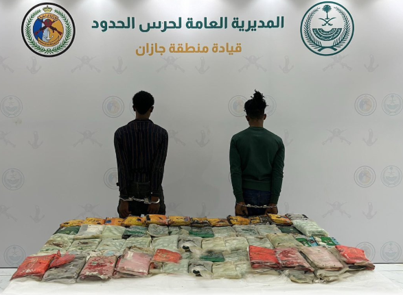 صراحة – جازان: قبضت الدوريات البرية لحرس الحدود في قطاع الدائر بمنطقة جازان على مخالفين لنظام أمن الحدود من الجنسية الإثيوبية، لتهريبهما (85.5) كيلوجرامًا من مادة الحشيش المخدر، وجرى استكمال الإجراءات النظامية الأولية بحقهما، وتسليمهما والمضبوطات لجهة الاختصاص.