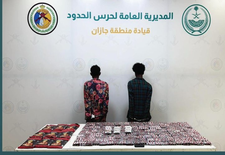 تمكّنت الدوريات البرية لحرس الحدود في قطاع العارضة بمنطقة جازان من القبض على مخالفين لنظام أمن الحدود من الجنسية الإثيوبية لتهريبهما 28,800 قرص خاضع لتنظيم التداول الطبي، إضافة إلى 10 كيلوجرامات من مادة الحشيش المخدر.