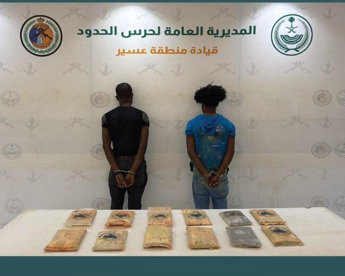 تمكنت الدوريات البرية لحرس الحدود في قطاع الربوعة بمنطقة عسير من القبض على مخالفين لنظام أمن الحدود من الجنسية الإثيوبية، لتهريبهما (14) كيلوجرامًا من مادة الحشيش المخدر.
