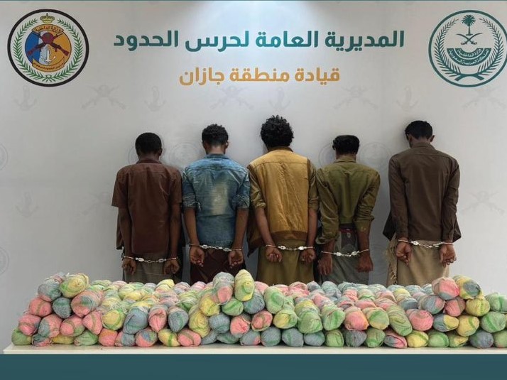 قبضت الدوريات البرية لحرس الحدود في قطاع الدائر بمنطقة جازان على خمسة مخالفين لنظام أمن الحدود من الجنسية اليمنية، أثناء محاولتهم تهريب كمية من نبات القات المخدر بلغ وزنها (180) كيلوجرامًا.