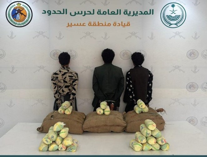تمكّنت الدوريات البرية لحرس الحدود في قطاع الربوعة بمنطقة عسير من القبض على ثلاثة مخالفين لنظام أمن الحدود من الجنسية اليمنبة، لتهريبهم (60) كيلوجرامًا من نبات القات المخدر.