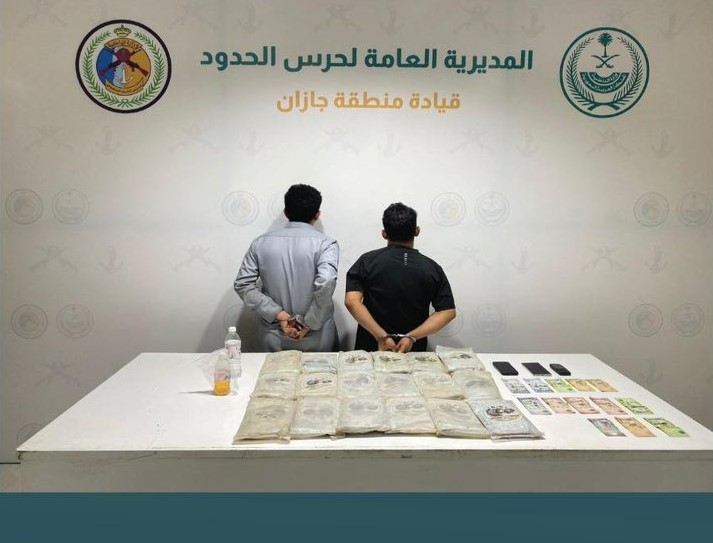 كما ألقت القبض على مواطنين، في قطاع العارضة بمنطقة جازان لتهريبهما (21) كيلوجرامًا من مادة الحشيش المخدر.