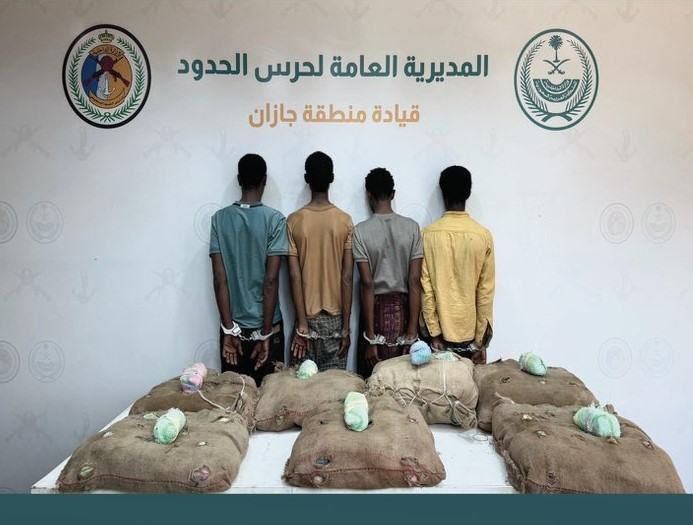 صراحة – جازان: قبضت الدوريات البرية لحرس الحدود في قطاع الدائر بمنطقة جازان على (4) مخالفين لنظام أمن الحدود من الجنسية الإثيوبية، لتهريبهم (140) كيلوجرامًا من نبات القات المخدر، وجرى استكمال الإجراءات النظامية الأولية بحقهم، وتسليمهم والمضبوطات لجهة الاختصاص.