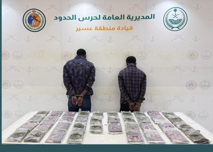 قبضت الدوريات البرية لحرس الحدود في قطاع الربوعة بمنطقة عسير على مخالفين لنظام أمن الحدود من الجنسية الإثيوبية، لتهريبهما (38) كيلوجراماً من مادة الحشيش المخدر.