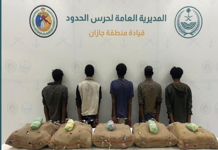 تمكّنت الدوريات البرية لحرس الحدود في قطاع الدائر بمنطقة جازان من القبض على خمسة مخالفين لنظام أمن الحدود من الجنسية الإثيوبية لتهريبهم 100 كيلوجرام من نبات القات المخدر.