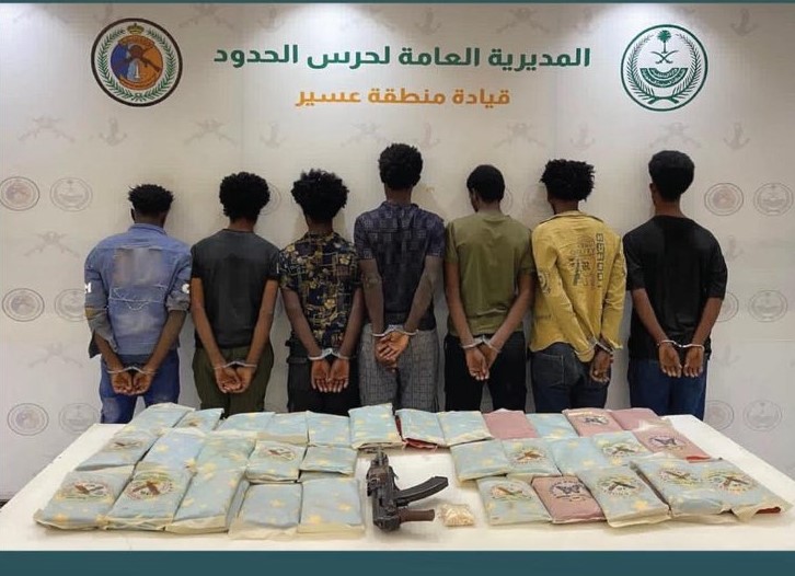 قبضت الدوريات البرية لحرس الحدود في قطاع الربوعة بمنطقة عسير من القبض على (7) مخالفين لنظام أمن الحدود من الجنسية الإثيوبية، لتهريبهم (950) قرصًا من مادة الإمفيتامين المخدر، و(71) كيلوجرامًا من مادة الحشيش المخدر.