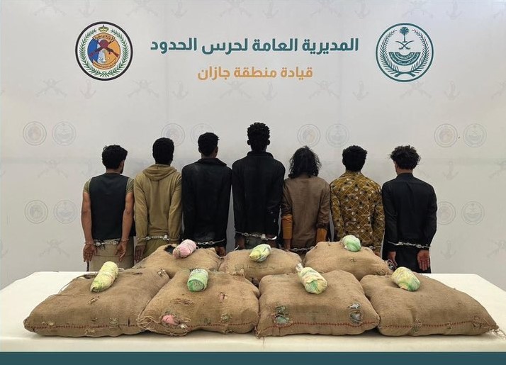 أعلنت الدوريات البرية لحرس الحدود في قطاع الدائر بمنطقة جازان عن القبض على (7) مخالفين لنظام أمن الحدود من الجنسيتين اليمنية والإثيوبية لتهريبهم (126) كيلوجرامًا من نبات القات المخدر.