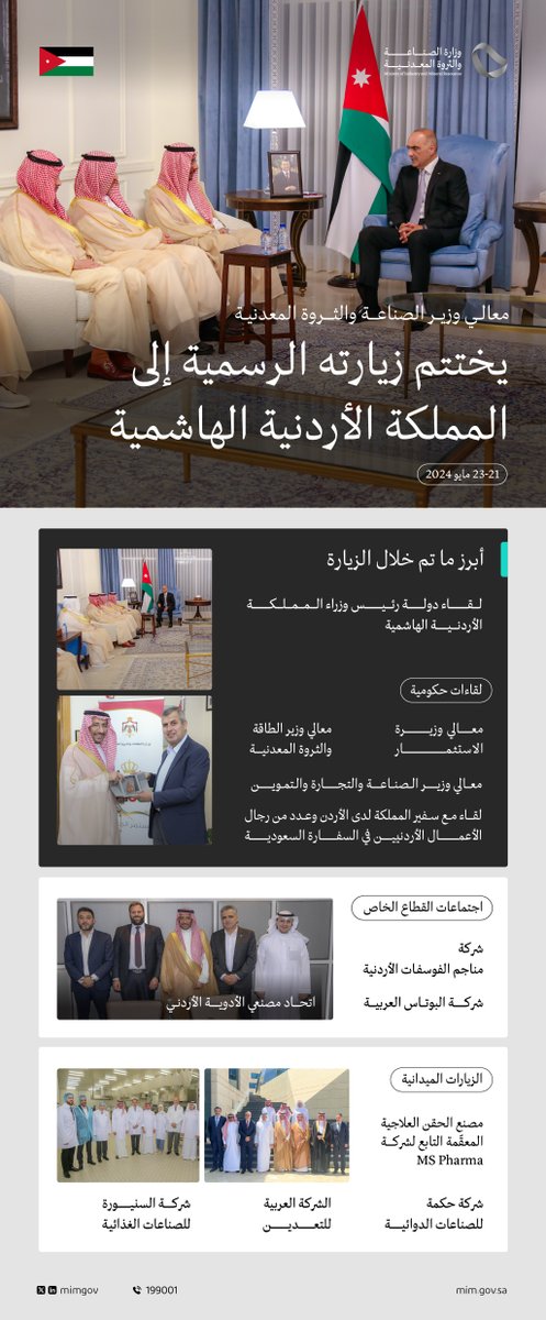 وتضمنت لقاءات معاليه، دولة رئيس الوزراء الأردني الدكتور بشر الخصاونة، ومعالي وزير الصناعة والتجارة والتموين السيد يوسف الشمالي، ومعالي وزيرة الاستثمار السيدة خلود السقاف، ومعالي وزير الطاقة والثروة المعدنية الدكتور صالح الخرابشة، حيث تمّ بحث سبل تعزيز التعاون الثنائي في المجالات الصناعية والتعدينية، وجذب الاستثمارات، والاستفادة من الفرص الواعدة المتاحة في كلا البلدين، ومناقشة آليات تطوير التعاون في مجالات الصناعات الغذائية.