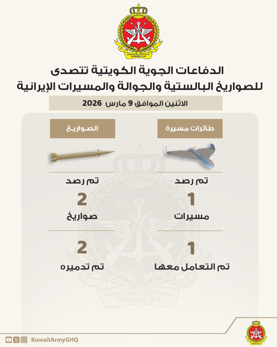وقال المتحدث الرسمي باسم وزارة الدفاع الكويتية العقيد الركن سعود عبدالعزيز العطوان، في بيان رقم (23)، إن منظومات الدفاع الجوي رصدت عدد (2) صاروخ باليستي معادٍ في جنوب البلاد، وتمكنت من اعتراضهما وتدميرهما.