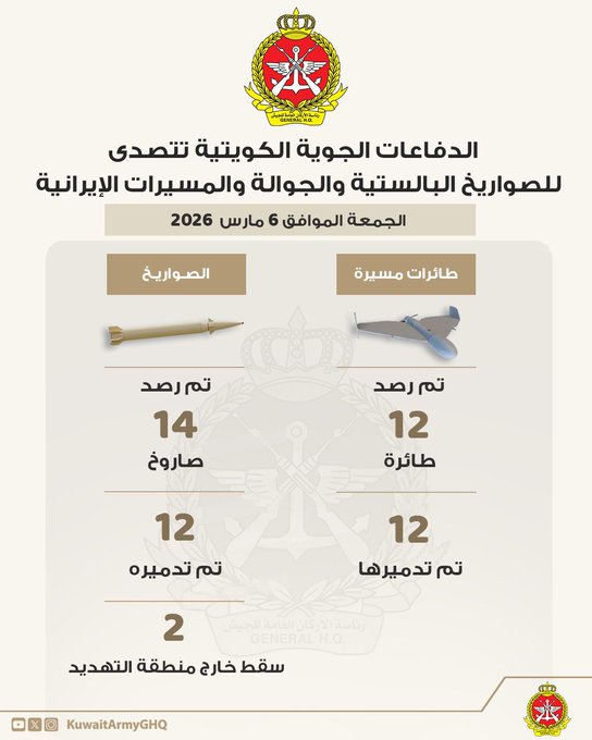 #الكويت : الدفاعات الجوية تعترض 12 مسيّرة و14 صاروخاً من #إيران