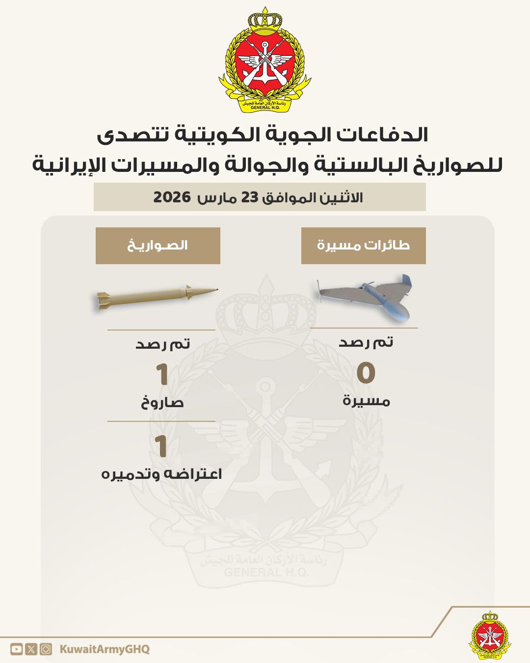 أعلنت وزارة الدفاع في دولة الكويت، على لسان المتحدث الرسمي العقيد الركن سعود عبدالعزيز العطوان، أن القوات المسلحة رصدت خلال الـ24 ساعة الماضية صاروخًا باليستيًا معاديًا داخل المجال الجوي الكويتي، وتمكنت من اعتراضه وتدميره بنجاح.