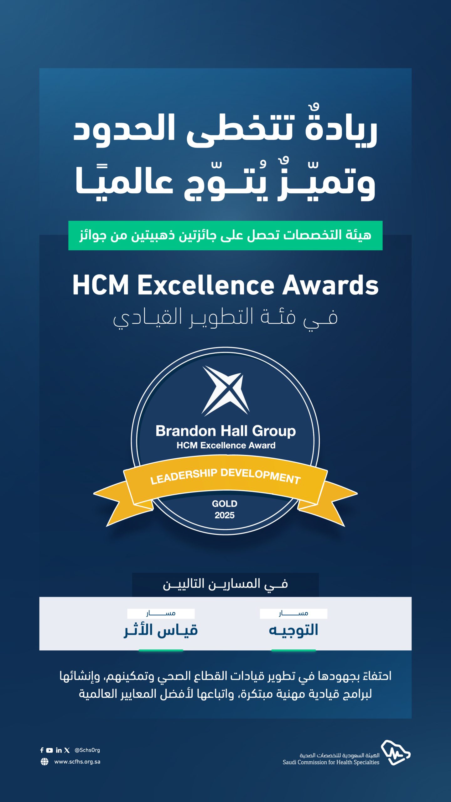 صراحة – الرياض: حققت الهيئة السعودية للتخصصات الصحية، جائزتين ذهبيتين ضمن جوائز “Brandon Hall Group HCM Excellence Award” العالمية، وذلك في فئة التطوير القيادي لمسار التوجيه ومسار قياس الأثر.