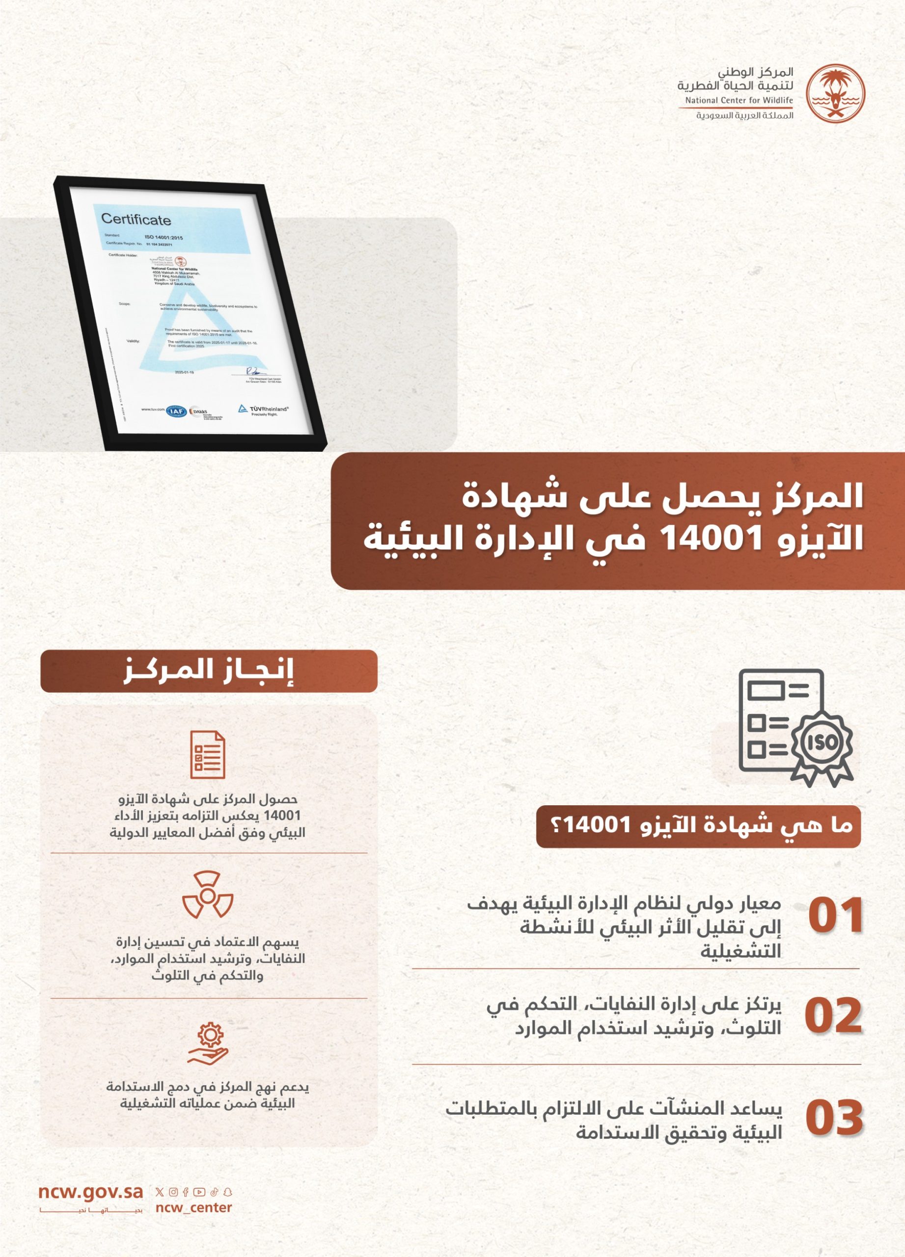 حصل المركز الوطني لتنمية الحياة الفطرية على شهادة الآيزو “ISO 14001” في الإدارة البيئية، عقب استيفائه متطلبات المعيار الدولي المعتمد لتحسين الأداء البيئي وتقليل الآثار المرتبطة بالأنشطة التشغيلية، دعمًا لجهوده في حماية الموارد الطبيعية وتعزيز الاستدامة البيئية.