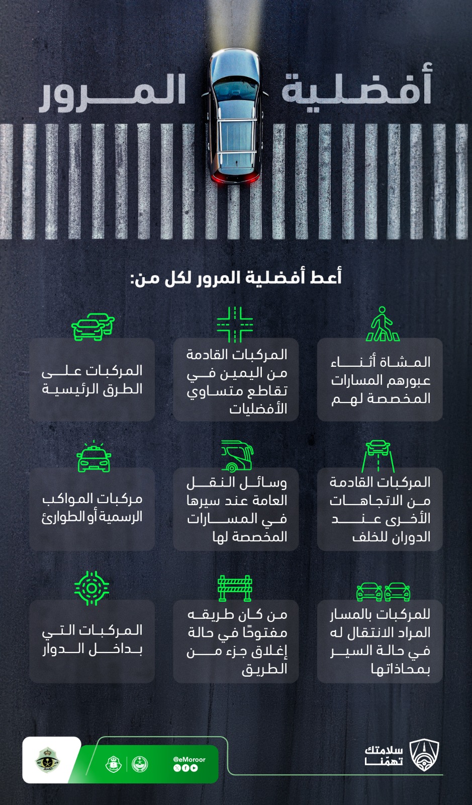 أكد المرور السعودي أن إعطاء أفضلية المرور للمركبات الأخرى يسهم بشكل كبير في تحقيق السلامة المرورية على الطرق، موضحاً الحالات التي يجب فيها إعطاء الأفضلية لكل من: