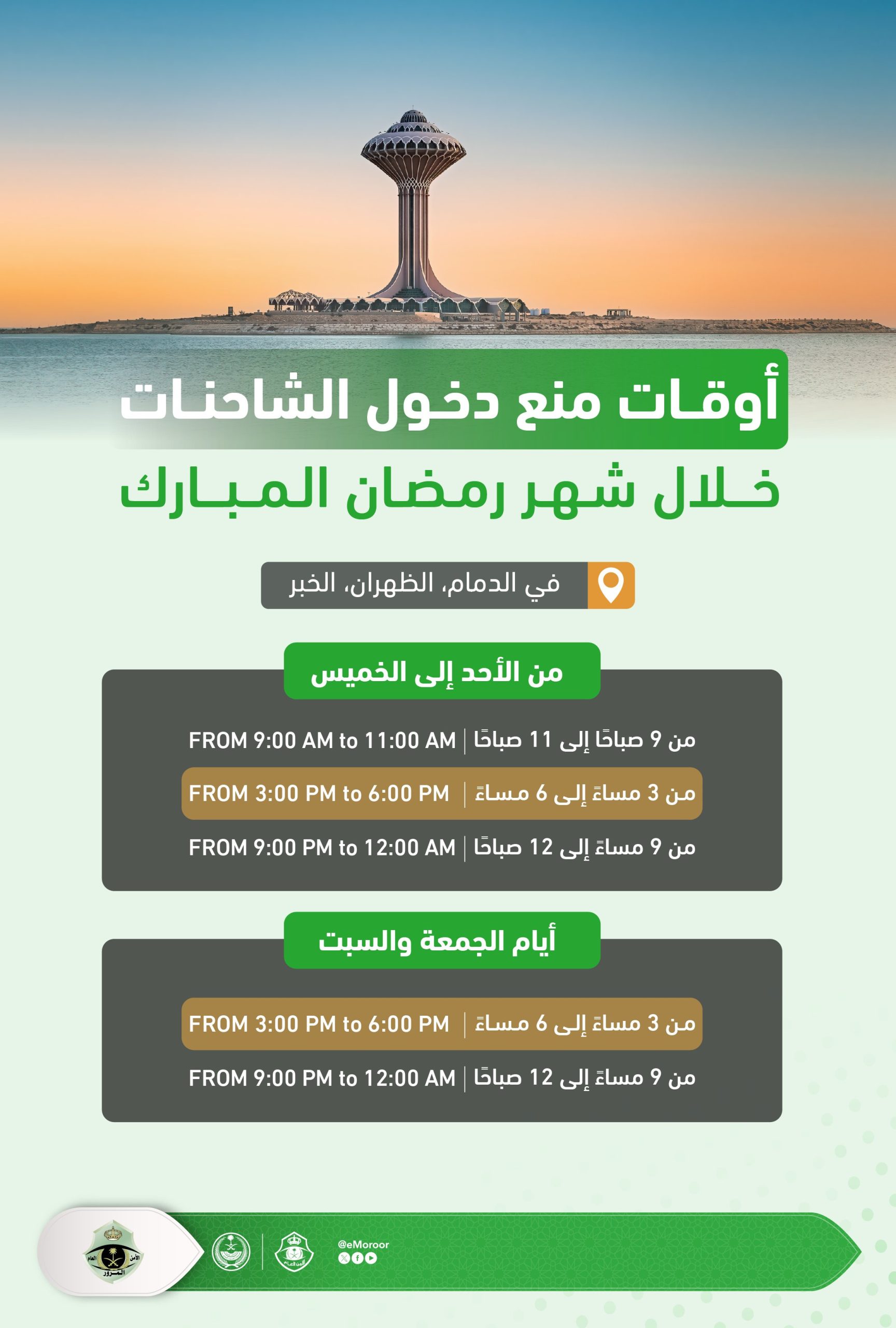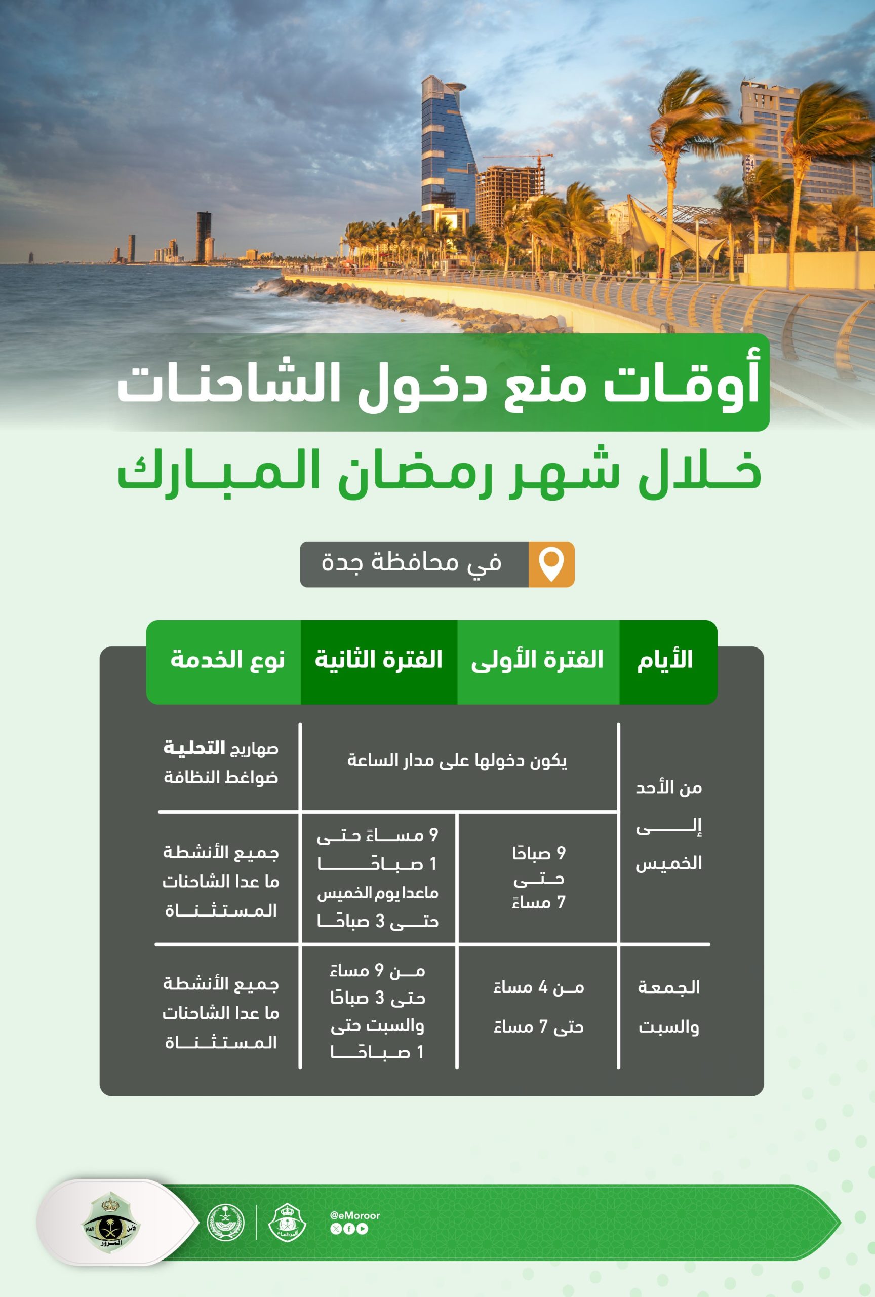 المرور يعلن أوقات منع دخول الشاحنات في جدة والمنطقة الشرقية خلال شهر رمضان