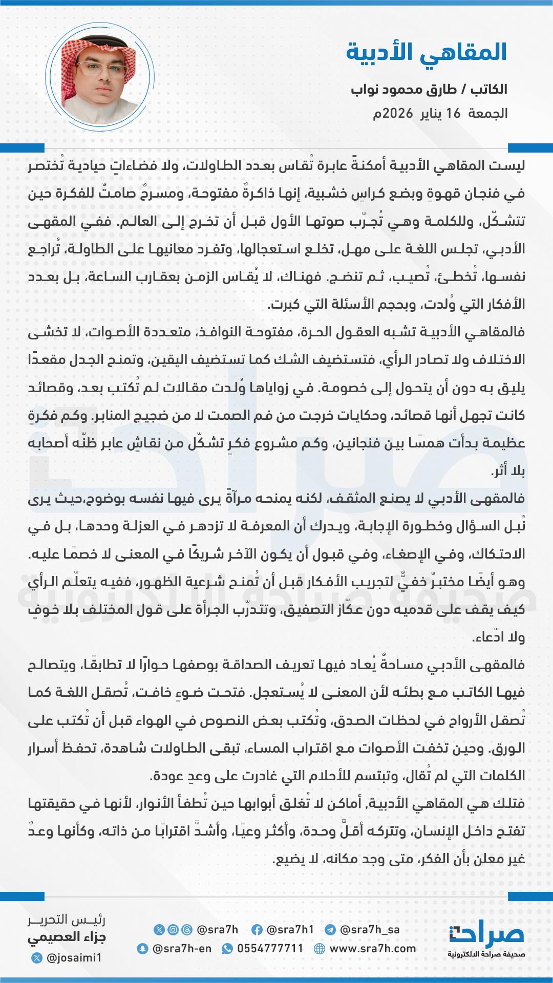 ليست المقاهي الأدبية أمكنةً عابرة تُقاس بعدد الطاولات، ولا فضاءاتٍ حيادية تُختصر في فنجان قهوةٍ وبضع كراسٍ خشبية، إنها ذاكرةٌ مفتوحة، ومسرحٌ صامتٌ للفكرة حين تتشكّل، وللكلمة وهي تُجرّب صوتها الأول قبل أن تخرج إلى العالم. ففي المقهى الأدبي، تجلس اللغة على مهل، تخلع استعجالها، وتفرد معانيها على الطاولة، تُراجع نفسها، تُخطئ، تُصيب، ثم تنضج. فهناك، لا يُقاس الزمن بعقارب الساعة، بل بعدد الأفكار التي وُلدت، وبحجم الأسئلة التي كبرت.