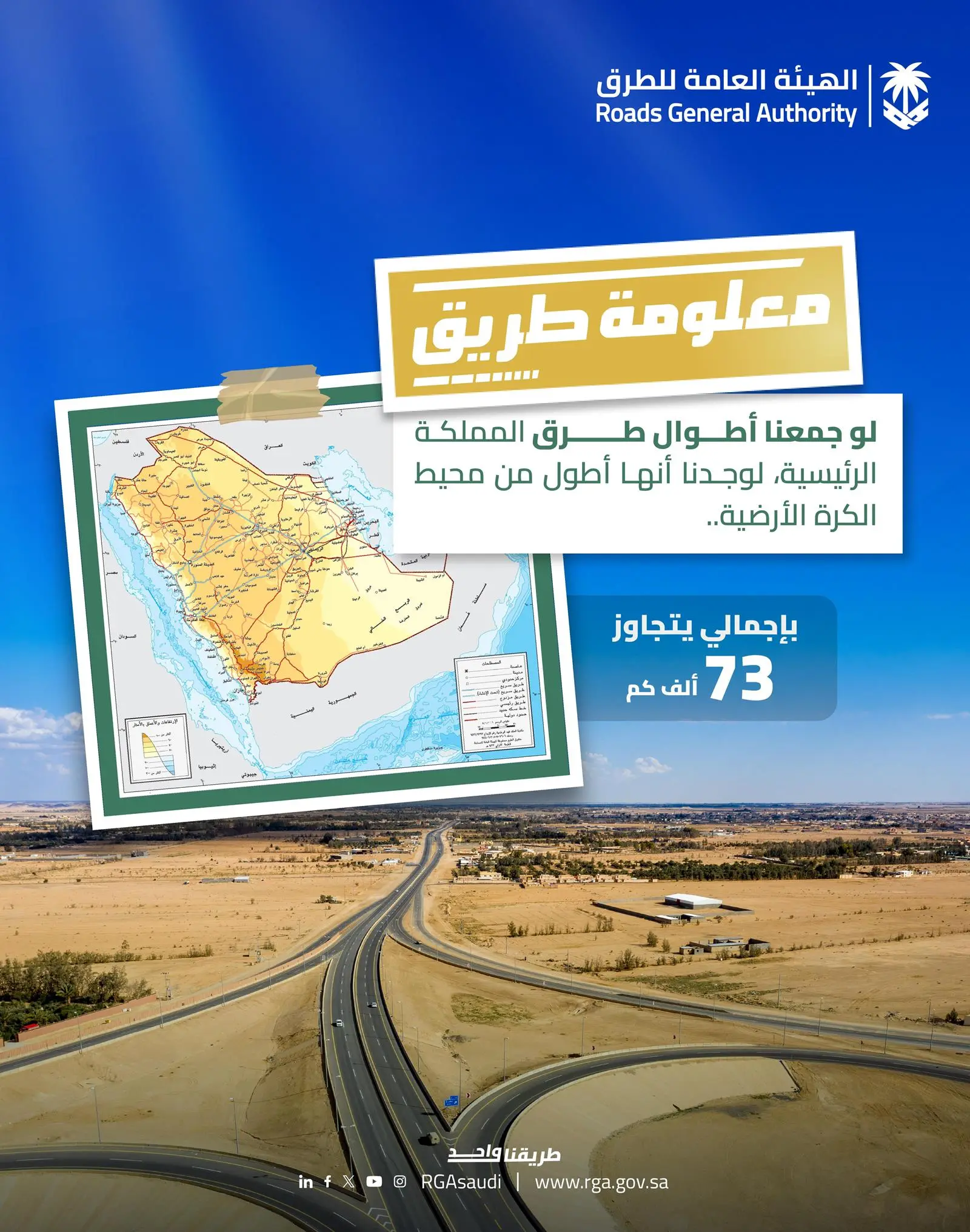 تتمتع المملكة بشبكة طرق واسعة النطاق، يتجاوز طولها محيط الكرة الأرضية، حيث يبلغ إجمالي طولها أكثر من (73) ألف كم، مقارنة بمحيط الأرض الذي يصل إلى (40,075) كم.