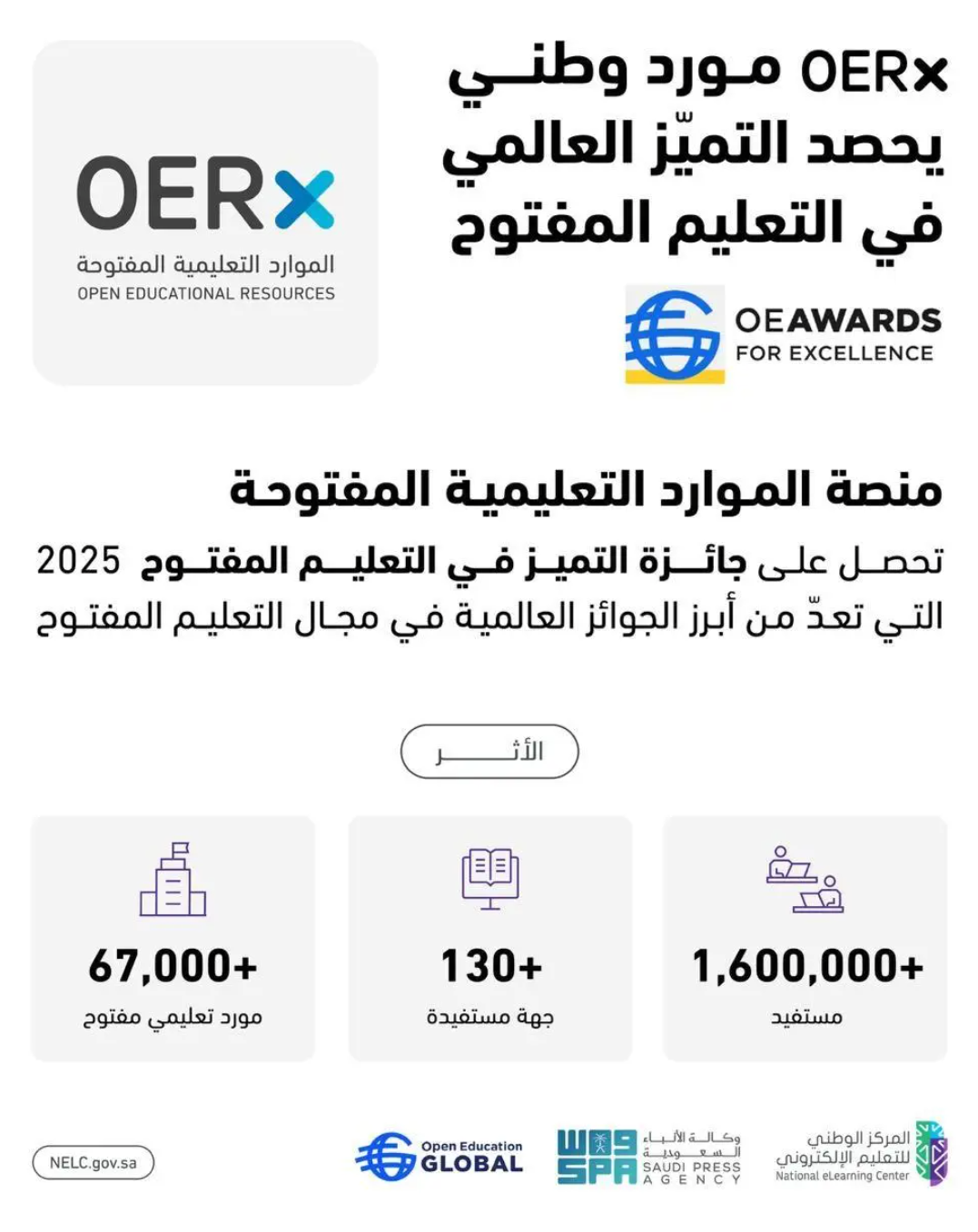 حققت المنصة الوطنية للموارد التعليمية المفتوحة (OERx) التابعة للمركز الوطني للتعليم الإلكتروني جائزة التميّز في التعليم المفتوح لعام (2025) من منظمة التعليم المفتوح العالمية (Open Education Global)، وذلك ضمن فئة الابتكار في الموارد التعليمية المفتوحة، التي تُعد من أبرز الجوائز الدولية الداعمة لجهود نشر المعرفة وتمكين التعليم المفتوح.