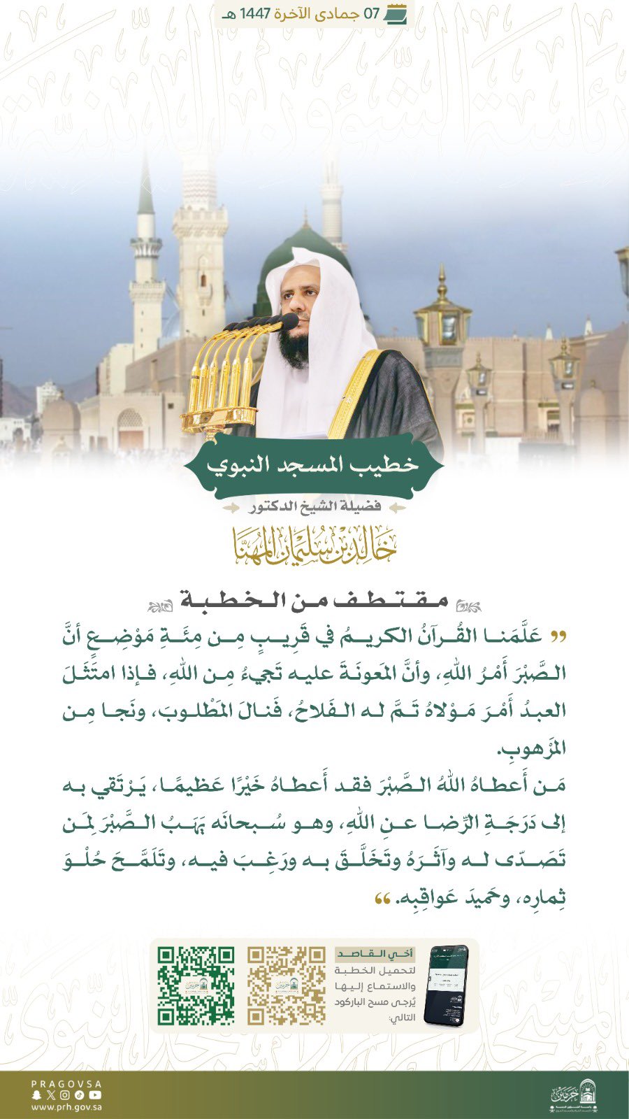 ‏”المهنا” في ‎#خطبة_الجمعة بالمسجد النبوي: المتخلق بالصبر قد آتاه الله قوةً لتقويم نفسه وغلبتها