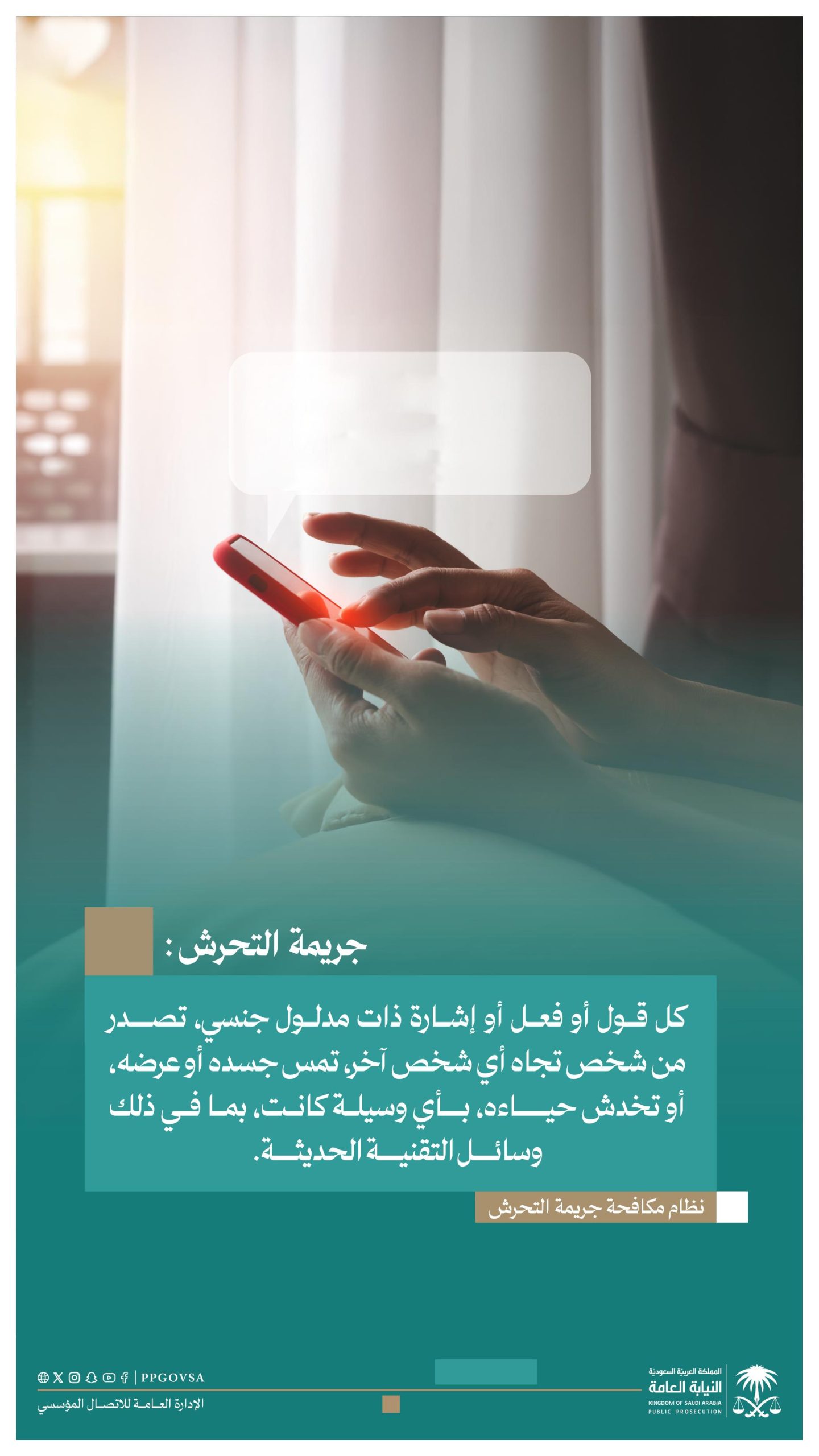 وأوضحت النيابة أن جريمة التحرّش تشمل الأفعال المرتكبة عبر الوسائل التقنية الحديثة، بما في ذلك منصات التواصل الاجتماعي والتطبيقات الرقمية، مشددة على ضرورة الالتزام بالأنظمة واحترام القيم المجتمعية.