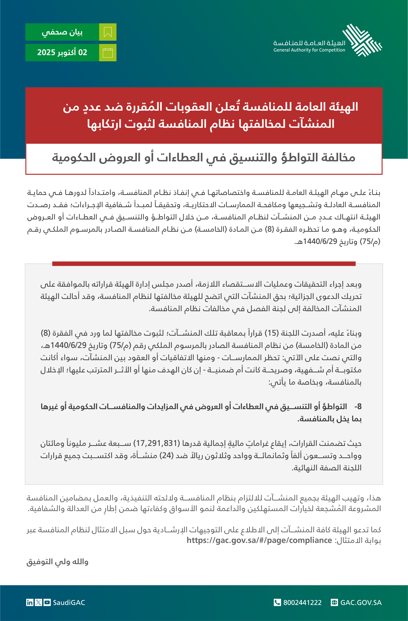 الهيئة العامة للمنافسة تعلن تغريم 24 منشأة مخالفة بأكثر من 17.2 مليون ريال #عاجل
