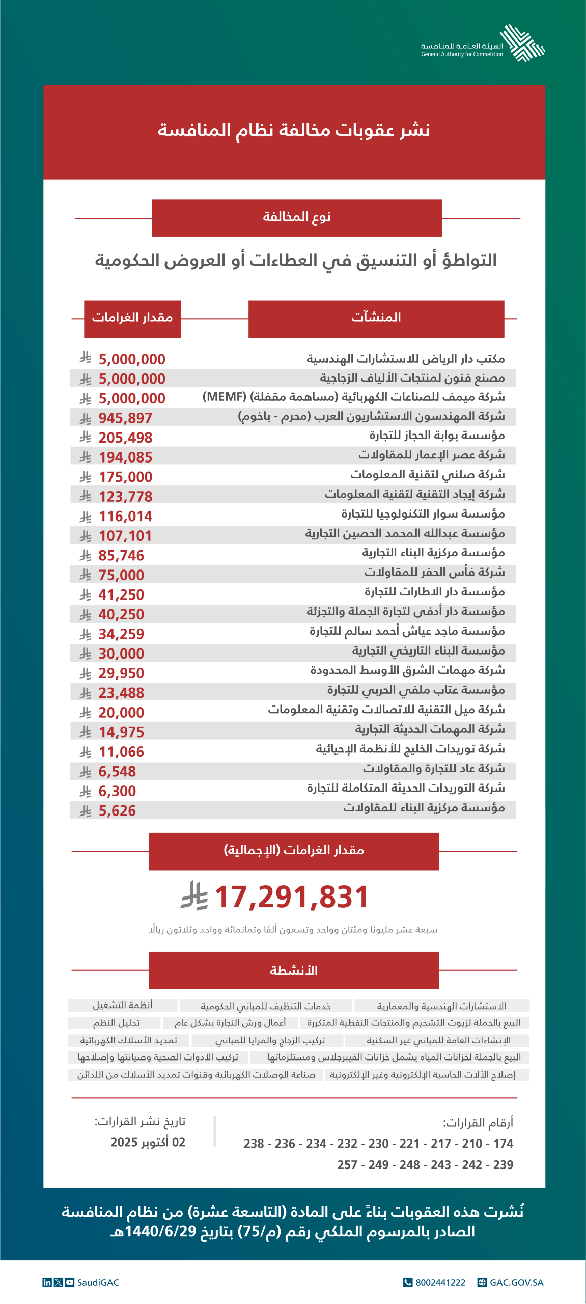 حيث تضمنت القرارات، إيقاع غراماتٍ ماليةٍ إجمالية قدرها (17,291,831) سبعة عشر مليوناً ومائتان وواحد وتسعون ألفاً وثمانمائة وواحد وثلاثون ريالاً ضد (24) منشأة، وقد اكتسبت جميع قرارات اللجنة الصفة النهائية.