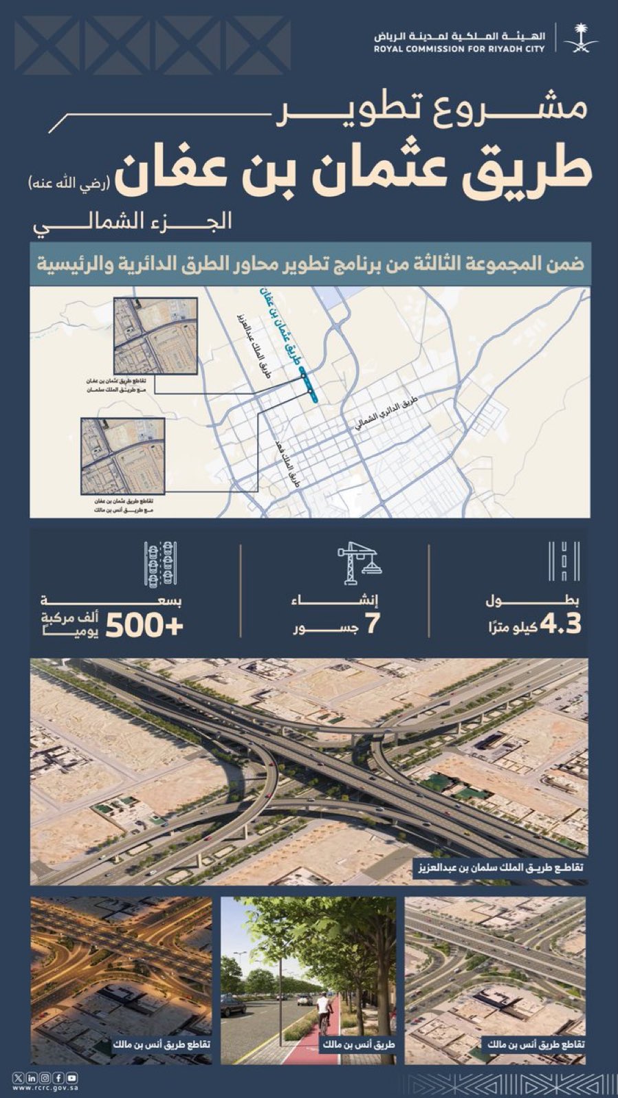 ضمن مشاريع المجموعة الثالثة من برنامج تطوير محاور الطرق الدائرية والرئيسية بمدينة الرياض، تنفذ الهيئة الملكية لمدينة الرياض مشروع تطوير طريق عثمان بن عفان (رضي الله عنه).