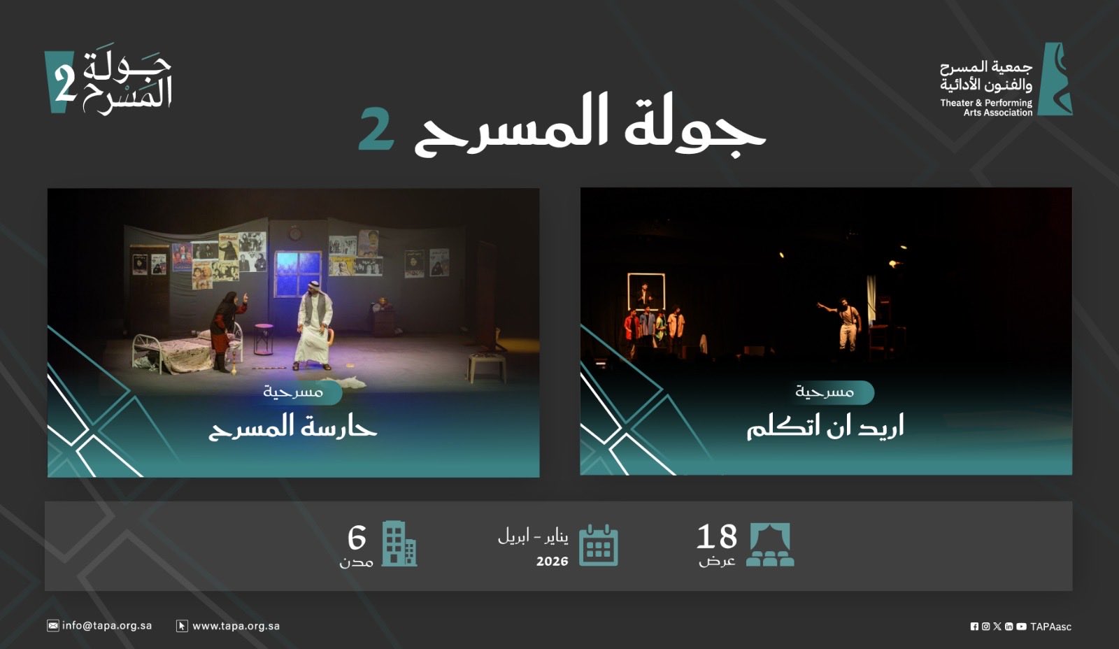 وأكدت الجمعية أن الجولة، تأتي امتدادًا لجهودها في تمكين الفرق المسرحية المحلية، ودعم المواهب الوطنية، وتفعيل المسرح كأداة ثقافية مؤثرة وتنشيط الحراك الثقافي والمسرحي في المدن والمحافظات بما يحقق جودة الحياة لجميع فئات المجتمع وبما يتماشى مع مستهدفات هيئة المسرح والفنون الأدائية في نشر الفنون وتعزيز حضورها في مختلف مناطق المملكة.