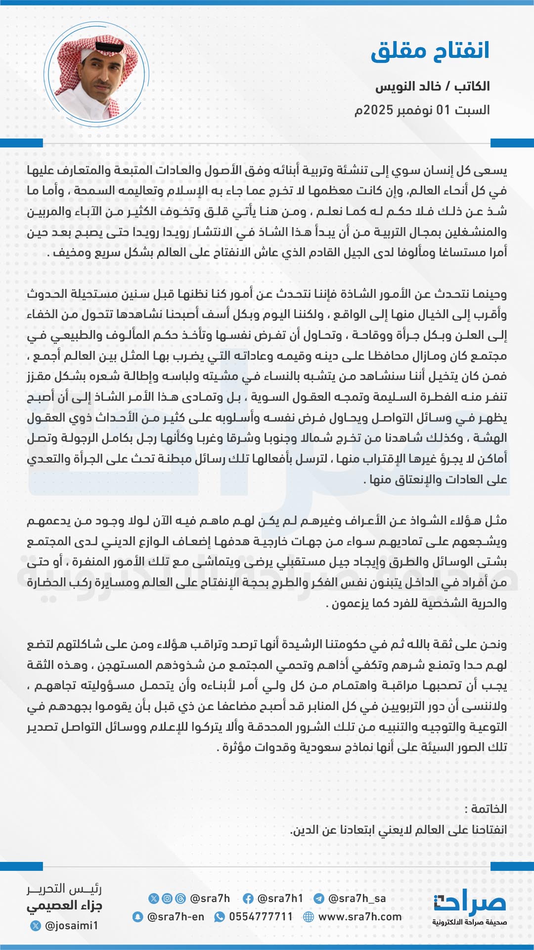 ونحن على ثقة بالله ثم في حكومتنا الرشيدة أنها ترصد وتراقب هؤلاء ومن على شاكلتهم لتضع لهم حدا وتمنع شرهم وتكفي أذاهم وتحمي المجتمع من شذوذهم المستهجن ، وهذه الثقة يجب أن تصحبها مراقبة واهتمام من كل ولي أمر لأبناءه وأن يتحمل مسؤوليته تجاههم ، ولاننسى أن دور التربويين في كل المنابر قد أصبح مضاعفا عن ذي قبل بأن يقوموا بجهدهم في التوعية والتوجيه والتنبيه من تلك الشرور المحدقة وألا يتركوا للإعلام ووسائل التواصل تصدير تلك الصور السيئة على أنها نماذج سعودية وقدوات مؤثرة .