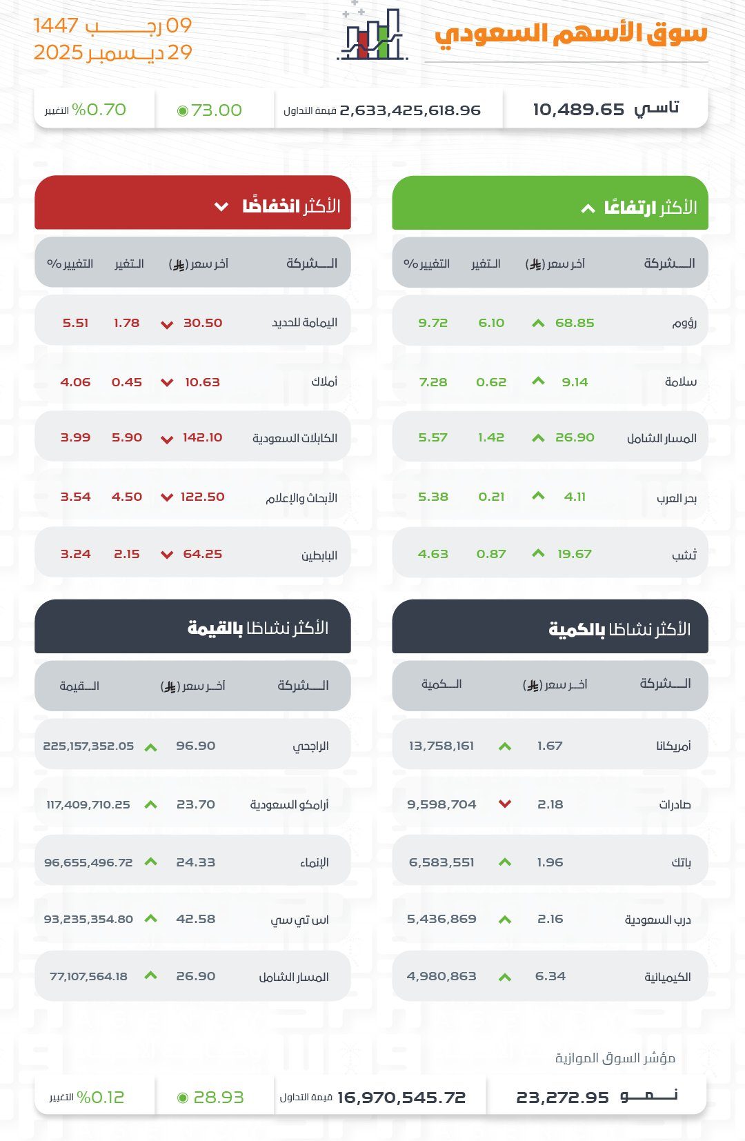 أغلق مؤشر الأسهم السعودية الرئيس اليوم مرتفعًا بمقدار (73) نقطة، ليصل إلى مستوى (10489.65) نقطة، وبتداولات بلغت قيمتها (2.6) مليار ريال.