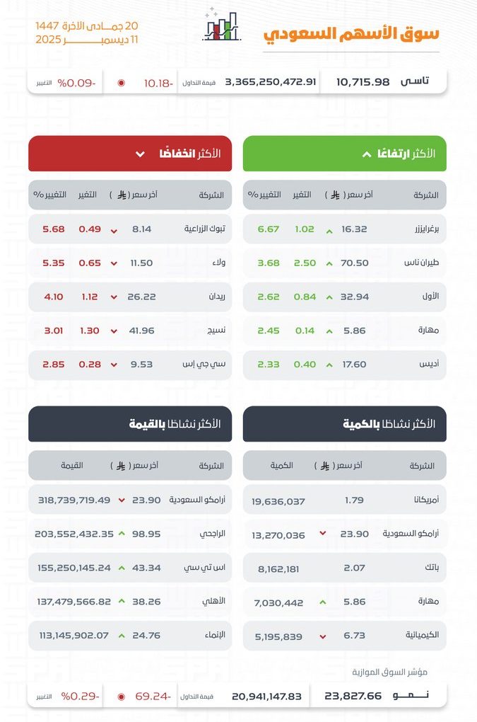 فيما كانت أسهم شركات أمريكانا، وأرامكو السعودية، وباتك، ومهارة، والكيميائية هي الأكثر نشاطًا بالكمية، وكانت أسهم شركات أرامكو السعودية، والراجحي، وstc، والأهلي، والإنماء هي الأكثر نشاطًا في القيمة.